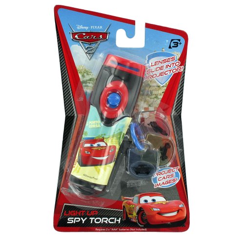 Dieser Handprojektor wirft drei verschiedene Cars 2 Motive auf eine Oberfläche, die einzeln vor die Projektionslampe geschoben werden können. Der Griff ist mit einem Cars 2 Motivsticker versehen, der abgelöst werden kann. Batteriebetrieben (2xAAA sind nicht enthalten).